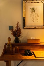 To bring her pieces to life, Sarah immersed herself in the very environment she sought to portray. She visited while the lodge was still under construction, trekking through trails alive with butterflies and birds, pausing beneath giant fig trees wrapped in climbing epiphytes, and searching for orchids hidden among moss and bark. “One day we passed a group of giraffes weaving their way elegantly between the trees,” she recalls, “and I loved watching the black and white colobus monkeys with their stunning long tails.” There were moments of quiet observation, the shimmer of a red duiker in dappled light, and moments of vibrant sound, like the near-deafening chorus of frogs in the glade before the lodge.