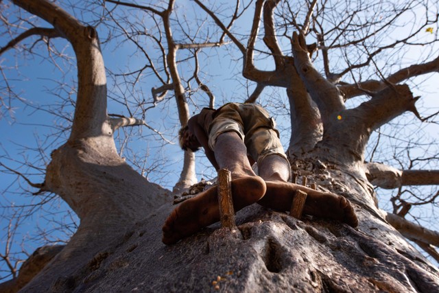 Babaa has spent the morning hunting and foraging. His stomach is full of endushube berries, and a couple of fat guinea fowl hang limply from his twine belt. The long trek in search of food has left him parched. He could dig for water in the dry riverbed, but that would mean a detour on his way back to his family’s temporary camp. Instead, he spots a towering baobab tree and makes his way toward it. Laying his bow and arrows at its base, he climbs up the trunk, using wooden stakes hammered into the bark by his people generations ago.